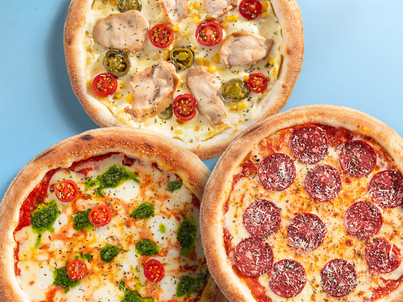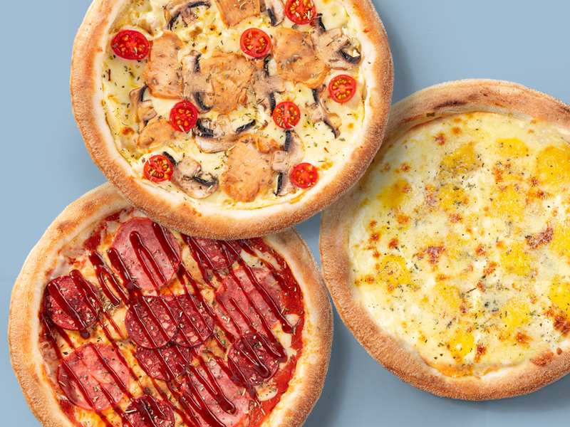 Пицца 4 сыра 25см,пицца Курица грибы 25см,пицца Мясная 25 см 1200гр.