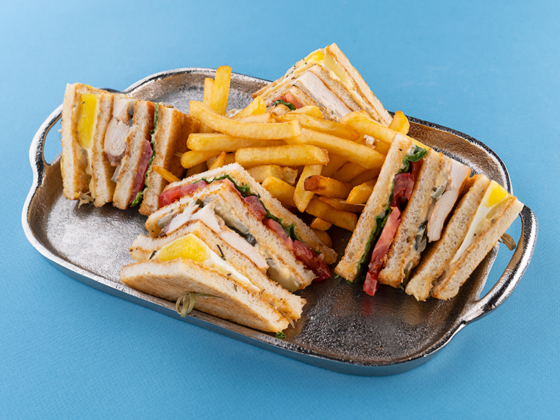Куриное филе, фирменный соус, картофель фри, яйцо куриное, помидор, битые огурцы, микс салата, соус сырный, хлеб Harrys 500 г.
